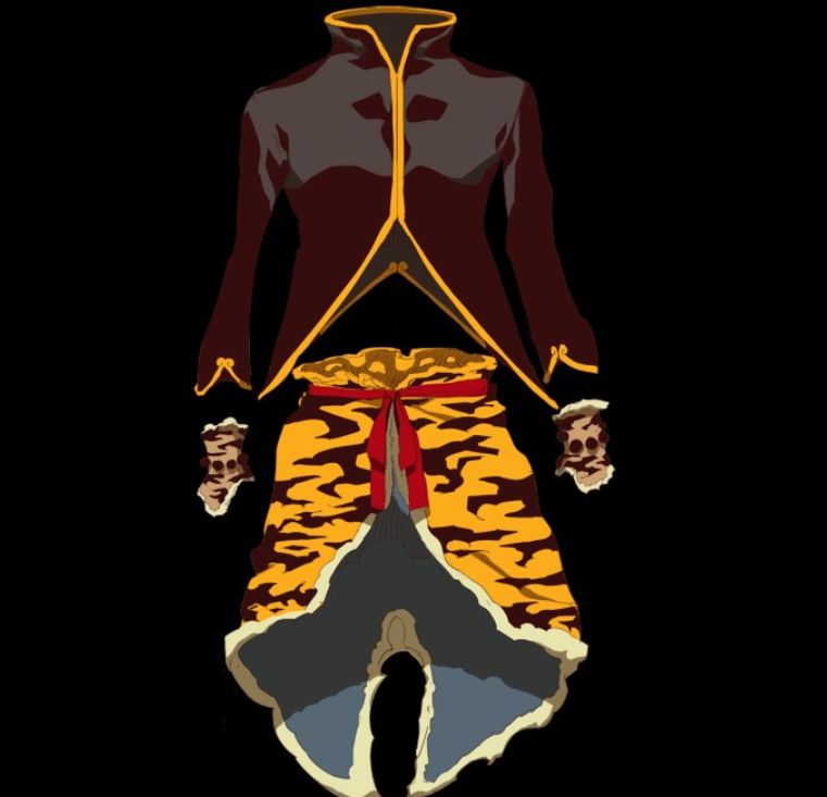 It has the appearance of a black jacket with a yellow fur covering grey pants and a red belt on him. When not equipped by the Monkey King, it takes the form of a mass of red and black energy.